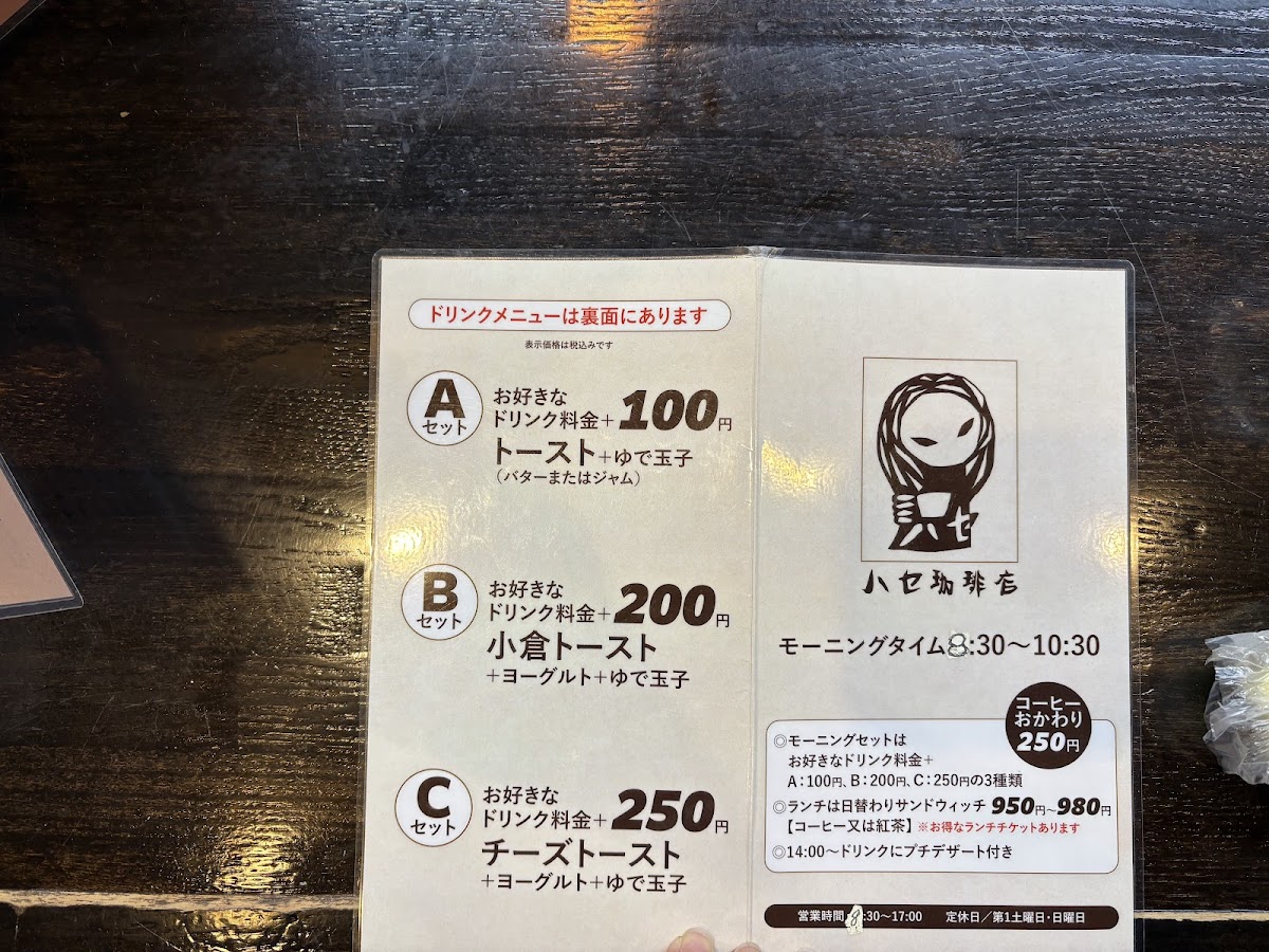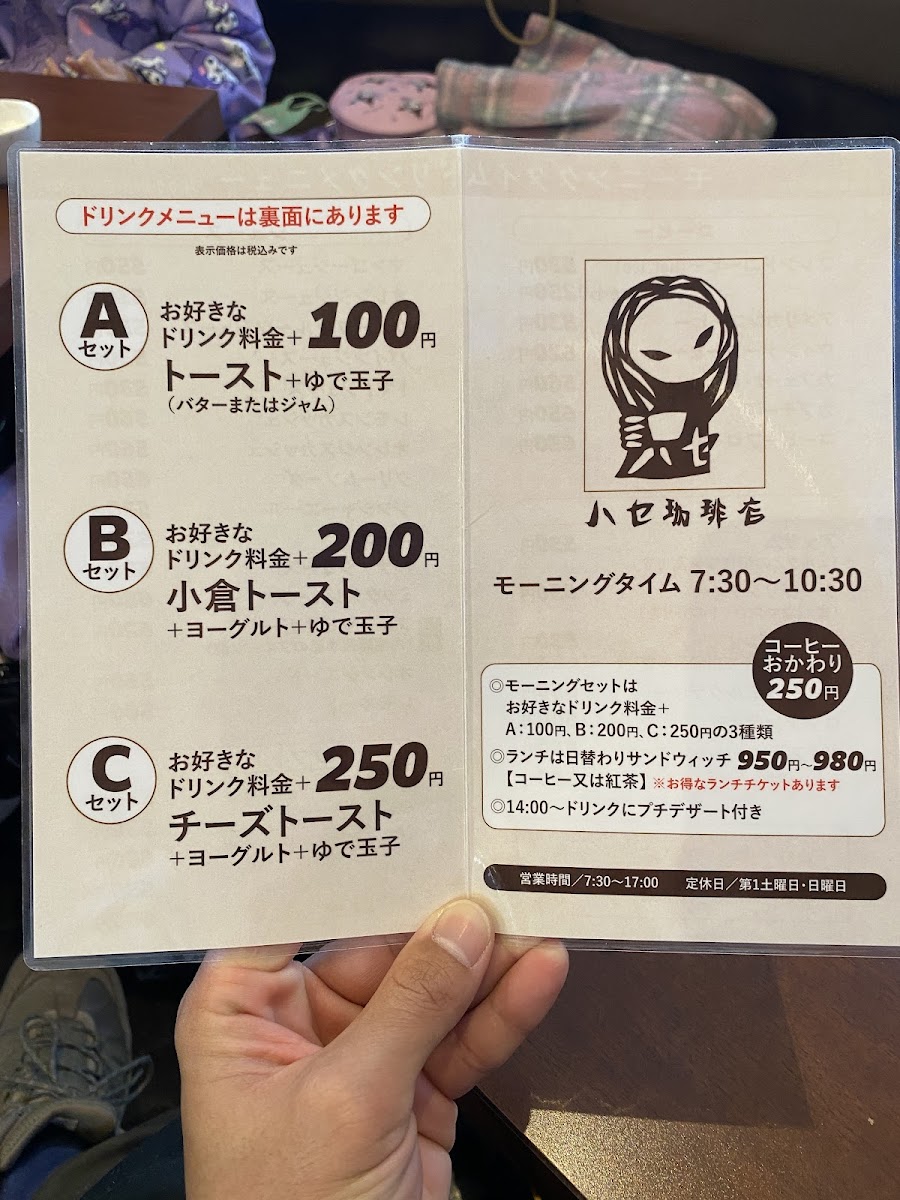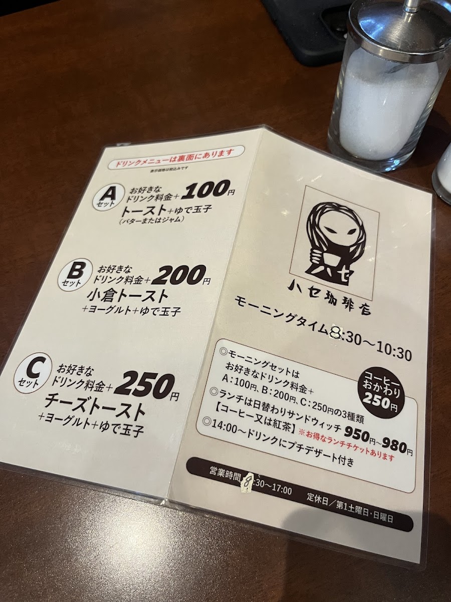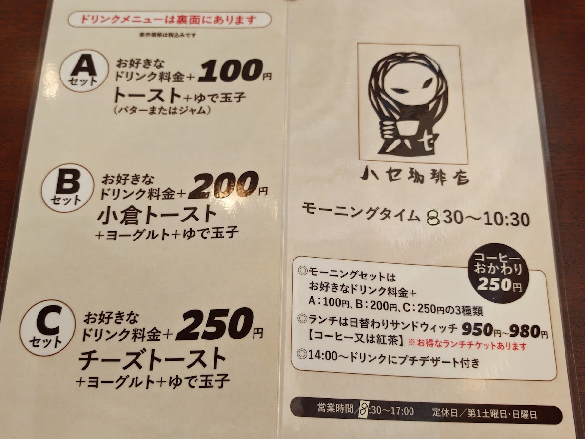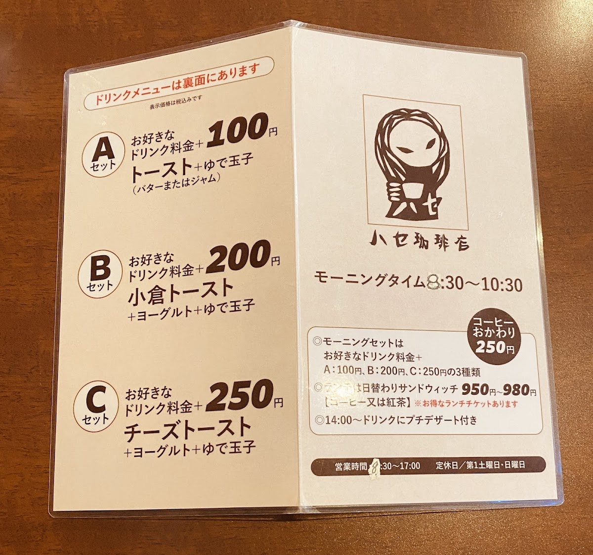 If you're a coffee enthusiast, don't miss the ブレンドコーヒー でっせ (Blend Coffee "Desse") or the hot option of ブレンドコーヒー ホット (Hot Blend Coffee) to enjoy the rich flavors of Hase Coffee's specialty brew. For a lighter touch, the アイスココア (Iced Cocoa) offers a refreshing and sweet alternative.