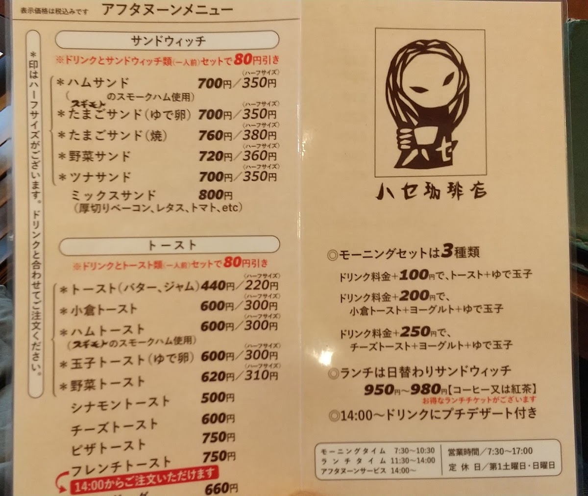 The menu at Hase Coffee offers a delightful mix of flavors that cater to a wide range of tastes. Among the standout options, トーストバタージャム (Toast with Butter and Jam) provides a simple yet comforting start to the day. For coffee lovers, アメリカンコーヒー (American Coffee) is a classic choice, while those looking for something richer can enjoy a ウインナーコーヒー (Wiener Coffee), which adds a creamy touch to the traditional coffee experience.